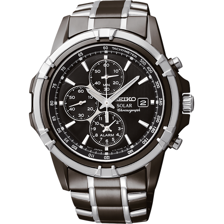 Seiko Solar Alarm Chronograph. No battery change required and powered by all types of light. Solar cell with high performance electricity generation. Energy-efficient movement with long power reserve. This handsome timepiece has a black ion-finished two-tone stainless steel case and bracelet. Its black dial features three chronograph subdials, luminous hands and markers, and date calendar. Alarm can be set on a 12-hour basis with two small hands. Chronograph measures up to 60 minutes in 1/5 second increments with split time measurement. Alarm hands can indicate the time in a different time zone. 100 meters water resistant.