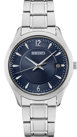 From the Essentials Collection. Offering classic dress/sport designs, the Essentials Collection provides the ideal solution for everyday wear. Crafted of stainless steel, this perfectly tailored watch features a patterned blue dial with date calendar, as well as Arabic numerals and stick markers, for a superb blend of clarity and style. The sapphire crystal adds superior scratch resistance. 10 bar, 100M Water Resistant