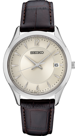 From the Essentials Collection. Offering classic dress/sport designs, the Essentials Collection provides the ideal solution for everyday wear. Crafted of stainless steel, this perfectly tailored watch features a patterned antique white dial with date calendar, as well as Arabic numerals and stick markers, for a superb blend of clarity and style. With brown leather strap and a sapphire crystal for superior scratch resistance. 10 bar, 100M Water Resistant