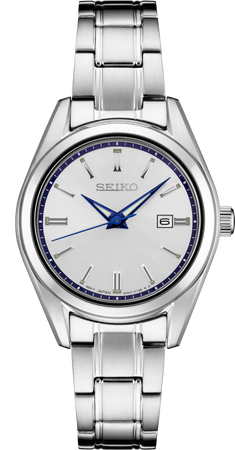 Seiko 140th Anniversary Essentials Limited Edition. Celebrating Seiko's 140th Anniversary with classic dress/sport design, this perfectly tailored Limited Edition is offered in two sizes to suit anyone's personal style. Featuring the signature 140th Anniversary blue and white colors, this versatile watch features a silver-white dial with vibrant blue hands, markers and accents. Providing the ideal solution for everyday wear, this perfectly balanced timepiece is crafted of stainless steel with scratch-resistant sapphire crystal, date calendar, and LumiBrite hands and markers. 10 bar, 100M Water Resistant