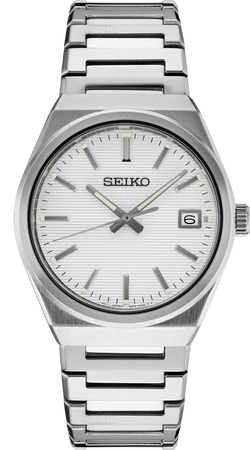 From the Essentials Collection. An updated classic, this sleekly angled watch features a silver pressed-pattern dial with simple stick indices, date calendar, and LumiBrite hands and markers. Crafted of stainless steel with a scratch-resistant sapphire crystal, this versatile timepiece includes a secure screwdown caseback and tri-fold push button release clasp. 10 bar, 100M Water Resistant