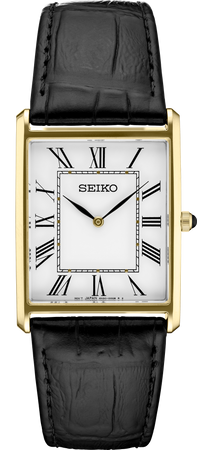 From the Essentials Collection. Offering classic designs, the Essentials Collection provides the ideal solution for everyday wear. Crafted of stainless steel in gold-tone finish, this elegant watch, with sophisticated rectangular case, features a traditional white dial with Roman numerals and finely shaped hands, cabochon crown and black leather strap for perfect day-to-evening style. 3 bar, 30M Water Resistant