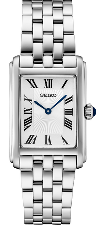 From the Essentials Collection. A sophisticated classic, perfectly proportioned for a jewelry-like feel, this elegant rectangular case watch offers a patterned white Roman numeral dial, blue hands and a blue cabochon crown. Crafted of stainless steel, this graceful design includes a five-row stainless steel bracelet for sleek wearing comfort, and a tri-fold push button release clasp. 5 bar, 50m Water Resistant
