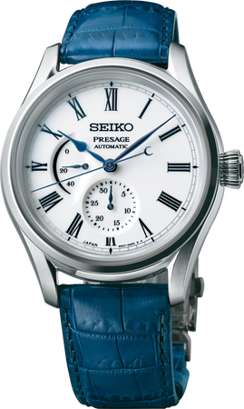 Presage Arita Porcelain Limited Edition. Offering the finest in Japanese mechanical watchmaking, the Presage Collection blends precision technology with superior craftsmanship and design. Inspired by Suigetsu, the Heian Period (794-1185 AD) noble tradition of viewing the moon through its reflection on ponds and sake cups, this exceptional watch is available only in a limited edition of 2,000, with serial number on each caseback. Handcrafted by master artisans in a unique snow-white color with gloss finish, the Arita porcelain dial features a power reserve indicator and calendar subdial. Completing the moon imagery are the finely crafted blue hands and markers as well as the light blue crocodile strap with tri-fold push button release clasp. A dual-curved sapphire crystal offers anti-reflective coating on the inner surface, while the screwdown see-through caseback provides a view of the 29-jewel automatic movement with manual winding capability, a frequency of 28,800 vibrations per hour and a power reserve of approximately 45 hours. Crafted of stainless steel. 10 bar, 100M Water Resistant