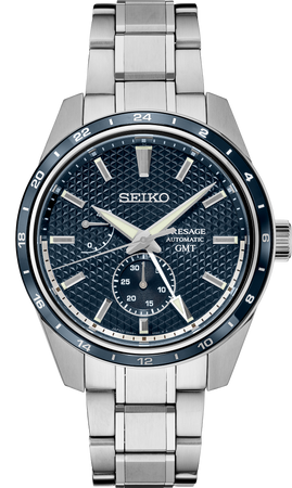 Presage Sharp-Edged Series GMT Limited Edition. Offering the finest in Japanese mechanical watchmaking, the Presage Collection blends precision technology with superior craftsmanship and design. Joining the coolly angular Sharp-Edged Series, celebrating the fresh look of contemporary Japanese design, this exceptional Limited Edition is available only in a controlled production run of 900. The brilliant blue dial, enhanced by a gloss finish and inspired by the summer view of Mt. Fuji and the magnificent natural landscape of Japan, features the Presage Sharp-Edged Series’ Asanoha hemp-leaf motif, a symbol of growth and prosperity dating to the Heian Period (794-1185 AD). Crafted of stainless steel with super-hard coating, this extraordinary watch offers a 29-jewel automatic movement, with GMT complication, that beats at a frequency of 28,800 vibrations per hour, with a power reserve of approximately 45 hours and manual winding capability. The dial, framed by a matching blue bezel, includes a 24-hour GMT hand, power reserve indicator, date display and LumiBrite hands and markers. A sapphire crystal features anti-reflective coating on the inner surface, while the tri-fold push button release clasp offers secure and comfortable wear. Packaged with an additional blue cordovan strap in a Limited Edition collectors’ box. 10 bar, 100M Water Resistant.