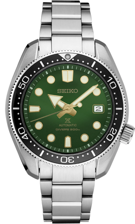 Prospex Automatic Diver. Designed for those who treat life as the ultimate adventure, the Seiko Prospex line follows every challenge with technological excellence and style. A modern reimagining of Seiko's landmark 1968 Diver's Watch, this dynamic design features a stainless steel case and bracelet with super-hard coating for nearly doubled hardness. Framed by a black one-way rotating elapsed timing bezel, the deep green sunray-finish dial features gold accents and includes a date calendar and LumiBrite hands and markers. For maximum visibility, the sapphire crystal offers anti-reflective coating on the inner surface. A 23-jewel automatic movement beats at a frequency of 21,600 vibrations per hour, with a power reserve of approximately 50 hours, and can be wound manually or automatically. With screwdown crown and caseback, as well as a tri-fold push button release clasp with secure lock and slide adjuster, this high-intensity timepiece follows ISO standards for scuba diving. 200m Water Resistant.