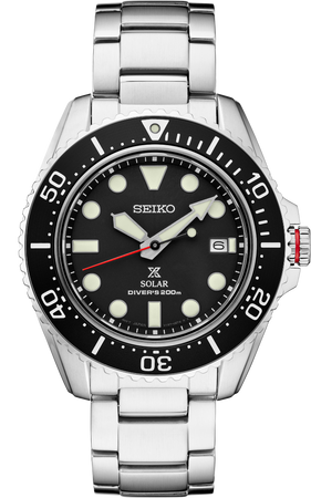 Prospex Solar Diver’s Watch. Designed for those who treat life as the ultimate adventure, Seiko Prospex keeps moving forward, meeting every challenge with technological excellence and winning design. Updated, with a larger case, but a sleeker and thinner profile, plus a scratch-resistant sapphire crystal, this handsomely tailored and superbly functional diver’s watch features an energy-efficient solar cell, powered by any light source, with no battery change required, and providing a 10-month power reserve when fully charged. The highly legible black dial includes a date calendar and LumiBrite hands and markers. Following ISO standards for scuba diving at depths of up to 200 meters, this exceptional timepiece, crafted of stainless steel, includes a black uni-directional rotating elapsed timing bezel, tri-fold push button release clasp with secure lock and extender, and screwdown crown and caseback. 200m Water Resistant