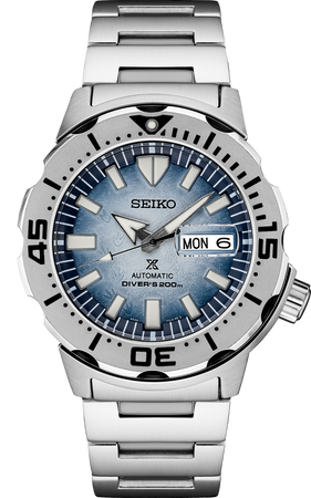 Prospex Special Edition. Designed for those who treat life as the ultimate adventure, Seiko Prospex keeps moving forward, meeting every challenge with technological excellence and winning design. With a gradient textured dial evoking the shimmering whites and blues of light reflecting off ice and the patterns of penguin footprints in the snow, this Special Edition automatic diver celebrates conservation efforts in Antarctica, the challenging environment in which the earliest Seiko diver’s watches proved their excellence as essential equipment for the Japanese Antarctic Research Expedition (JARE). Recalling one of Seiko’s most iconic diving styles, this rugged watch features a uni-directional rotating elapsed timing bezel with a deeply grooved edge. Providing reliable timing in the most demanding conditions, the 24-jewel automatic movement beats at a frequency of 21,600 vibrations per hour, with a power reserve of approximately 41 hours, and offers manual winding capability. With magnified day/date calendar, and LumiBrite hands and markers, this high-intensity timepiece, following ISO standards for scuba diving at depths of up to 200 meters, is crafted of stainless steel, with secure screwdown crown and caseback. 200m Water Resistant