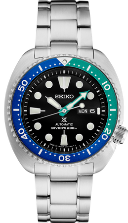 Prospex Special Edition Diver's Watch. Designed for those who treat life as the ultimate adventure, Seiko Prospex keeps moving forward, meeting every challenge with technological excellence and winning design. Inspired by the colors of a tropical lagoon, this vibrant Special Edition features marine blue and green accents on its uni-directional rotating elapsed timing bezel, echoed by the green minute hand and accents on the black dial. The 24-jewel automatic movement beats at a frequency of 21 600 vibrations per hour, with a power reserve of approximately 41 hours, and offers manual winding capability. Based on an iconic Seiko design, this rugged and stylish watch follows ISO standards for scuba diving at depths of up to 200 meters. Crafted of stainless steel, with screw-down crown and caseback, date calendar, LumiBrite hands and markers, and tri-fold push button release clasp with secure lock and extender. 200m Water Resistant
