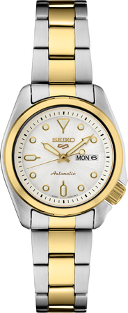 Seiko 5 Sports Collection. With street-smart design, this new, smaller Seiko 5 Sports timepiece offers an updated take on vintage styling for both durability and all-day versatility. Providing automatic technology that you control with every movement, this distinctive watch is powered by a 21-jewel movement that beats at a frequency of 21,600 vibrations per hour, with a power reserve of approximately 40 hours and manual winding capability. Framed by a 60-minute track marked in five-minute increments, the white sunray finish dial features a day/date calendar, and luminous hands and markers. Crafted of stainless steel in a two-tone finish, this effortlessly fashionable watch includes a screwdown caseback and tri-fold push button release clasp. 10 bar, 100M Water Resistant