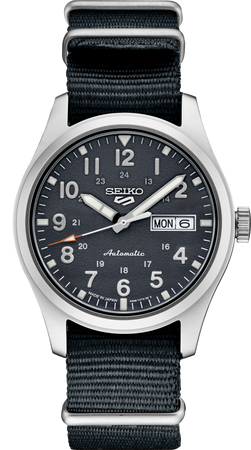 Seiko 5 Sports. Inspired by classic field/military design, this stylishly retro watch offers authentic lines with both durability and all-day excellence. Providing automatic technology that you control with every movement, this versatile watch is powered by a 24-jewel movement that beats at a frequency of 21,600 vibrations per hour, with a power reserve of approximately 41 hours and manual winding capability. The blue-gray dial features Arabic numerals, a day/date calendar, red-orange tipped second hand, and luminous hands and markers. Crafted of stainless steel with blue-gray nylon strap and a screwdown see-through caseback for a view of classic timekeeping in action. 10 bar, 100M Water Resistant