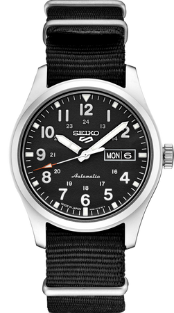Seiko 5 Sports. Inspired by classic field/military design, this stylishly retro watch offers authentic lines with both durability and all-day excellence. Providing automatic technology that you control with every movement, this versatile watch is powered by a 24-jewel movement that beats at a frequency of 21,600 vibrations per hour, with a power reserve of approximately 41 hours and manual winding capability. The black dial features Arabic numerals, a day/date calendar, red-orange tipped second hand, and luminous hands and markers. Crafted of stainless steel with black nylon strap and a screwdown see-through caseback for a view of classic timekeeping in action. 10 bar, 100M Water Resistant