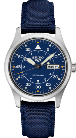 Seiko 5 Sports Collection. Inspired by the vintage designs worn by early pilots, this updated classic offers genuine style with both durability and all-day versatility. Providing automatic technology that you control with every movement, this distinctive watch is powered by a 24-jewel movement that beats at a frequency of 21,600 vibrations per hour, with a power reserve of approximately 41 hours and manual winding capability. With a 60-minute track marked in five-minute increments, the blue dial features a day/date calendar, and luminous hands and markers. The orange-tipped second hand provides bright punctuation, intensified by the matching orange liner of the blue nylon strap. Crafted of stainless steel with a screwdown see-through caseback for a view of classic timekeeping in action. 10 bar, 100M Water Resistant