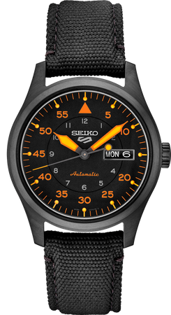 Seiko 5 Sports Collection. Inspired by the vintage designs worn by early pilots, this updated classic offers genuine style with both durability and all-day versatility. Providing automatic technology that you control with every movement, this distinctive watch is powered by a 24-jewel movement that beats at a frequency of 21,600 vibrations per hour, with a power reserve of approximately 41 hours and manual winding capability. With a 60-minute track marked in five-minute increments, the black dial features orange accents, a day/date calendar, orange-tipped second hand, and orange and yellow luminous hands and markers. The black nylon strap includes a bright orange lining. Crafted of stainless steel in a black ion finish with a screwdown see-through caseback for a view of classic timekeeping in action. 10 bar, 100M Water Resistant