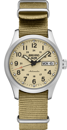 Seiko 5 Sports Collection. Inspired by the vintage field/aviator designs, this updated classic offers smart, casual style with both durability and all-day versatility. Providing automatic technology that you control with every movement, this distinctive watch is powered by a 24-jewel movement that beats at a frequency of 21,600 vibrations per hour, with a power reserve of approximately 41 hours and manual winding capability. Including a 60-minute track and a 13-24 hour military time scale, the beige dial features a day/date calendar, red-tipped second hand, and luminous hands and markers. With a mid-size case for an authentic look and feel, this exceptional watch is crafted of stainless steel with a beige nylon strap and a screwdown see-through caseback for a view of classic timekeeping in action. 10 bar, 100M Water Resistant