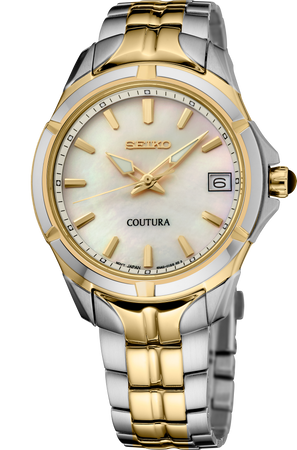 From the Coutura Collection. Expressing a polished and modern sophistication, the Coutura Collection combines bold angularity and elegant design with superior timekeeping for an effortless sport/dress aesthetic. This versatile timepiece, perfect for day-to-night style, features a classic white mother-of-pearl dial with gold applied indices, adding a rich 3-dimensional appearance to the elegant look. Crafted of stainless steel, with a perfectly proportioned case and bracelet for a streamlined fit, this graceful watch is topped with a scratch-resistant sapphire crystal and includes LumiBrite hands and markers, a date calendar, a classic cabochon crown, and a tri-fold push-button release clasp. 10 bar, 100M Water Resistant