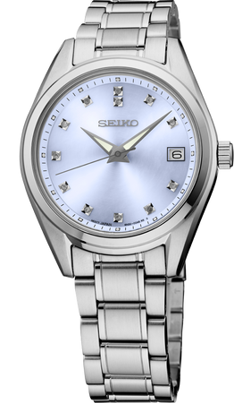 From the Diamond Collection. With elegant simplicity, this versatile design, perfect for dress or everyday wear, features a shimmering blue sunray finish dial set with 12 diamonds. Crafted of stainless steel, with a sleek, perfectly proportioned case and bracelet for a superior fit on the wrist, this graceful watch includes a scratch-resistant sapphire crystal, date calendar, and LumiBrite hands and markers. 10 bar, 100M Water Resistant