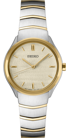 From the Essentials Collection. With sleek sophistication, this distinctively modern watch makes an immediate style statement. The clean, minimalist dial, in light champagne with simple stick markers, features a subtly varying metallic texture for added visual interest, while the soft curves of the bracelet are highlighted by a mirror and hairline finish. In stainless steel with versatile two-tone finish, this memorable timepiece includes a tri-fold push button release clasp. 5 bar, 50M Water Resistant