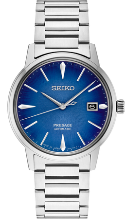 Seiko Presage Cocktail Time. Offering the finest in Japanese mechanical watchmaking, the Presage Collection blends precision technology with superior craftsmanship and design. Inspired by the vibrance of the city’s modern lounges, the newest Cocktail Time designs express the excitement of today’s Tokyo, with fresh styling and colors. Highlighted by a vivid blue dial with gradated tones, pressed pattern and gloss finish evoking the Aviation cocktail, this elegant design features a 23-jewel automatic movement, with manual winding capability, that beats at a frequency of 21,600 vibrations per hour, with a power reserve of approximately 41 hours. Crafted of stainless steel, this distinctive timepiece includes a calendar, box-shaped crystal, screwdown see-through caseback and double deployment clasp with push button release. 5 bar, 50M Water Resistant
