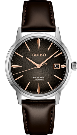 Seiko Presage Cocktail Time. Offering the finest in Japanese mechanical watchmaking, the Presage Collection blends precision technology with superior craftsmanship and design. Inspired by the vibrance of the city’s modern lounges, the newest Cocktail Time designs express the excitement of today’s Tokyo, with fresh styling and colors. Highlighted by a gray/brown dial with gradated tones, pressed pattern and gloss finish evoking the Irish Coffee cocktail, this elegant design features a 23-jewel automatic movement, with manual winding capability, that beats at a frequency of 21,600 vibrations per hour, with a power reserve of approximately 41 hours. Crafted of stainless steel, with brown leather strap, this distinctive timepiece includes a calendar, rose-gold accents, box-shaped crystal and screwdown see-through caseback. 5 bar, 50M Water Resistant