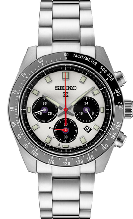 Prospex Speedtimer Solar Chronograph. Designed for those who treat life as the ultimate adventure, Seiko Prospex keeps moving forward, meeting every challenge with technological excellence and winning design. This rugged and stylish watch is part of a high-intensity collection inspired by the 1969 “Speedtimer,” the world’s first self-winding chronograph. Paying tribute to the iconic original with its two-tone gray and black aluminum tachymeter bezel and seconds markers positioned on the dial ring for a cleaner and clearer dial, this exceptional timepiece offers an enhanced emphasis on usability, legibility and visibility by adding LumiBrite hands and markers, a slightly larger case size and a tapered three-link bracelet. The chronograph function measures up to 60 minutes of elapsed time in 1/5-second increments and includes a split time function, while the solar cell, powered by any light source, with no battery change required, provides a 6-month power reserve when fully charged. The silver dial, in a brilliant sunray finish, features three black subdials, with a 24-hour indicator and power reserve indicator, as well as a date calendar and red chronograph hand. Crafted of stainless steel, with a curved anti-reflective sapphire crystal, secure screwdown caseback and tri-fold push button release clasp. 10 bar, 100M Water Resistant
