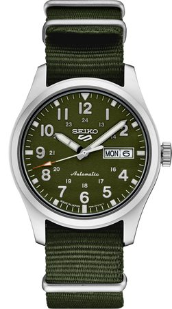Seiko 5 Sports. Inspired by classic field/military design, this stylishly retro watch offers authentic lines with both durability and all-day excellence. Providing automatic technology that you control with every movement, this versatile watch is powered by a 24-jewel movement that beats at a frequency of 21,600 vibrations per hour, with a power reserve of approximately 41 hours and manual winding capability. The green dial features Arabic numerals, a day/date calendar, red-orange tipped second hand, and luminous hands and markers. Crafted of stainless steel with green nylon strap and a screwdown see-through caseback for a view of classic timekeeping in action. 10 bar, 100M Water Resistant