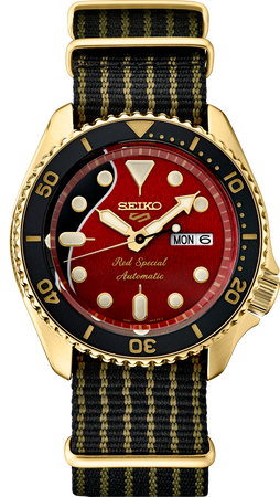 Seiko 5 Sports Brian May 2022 Limited Edition. Designed in collaboration with legendary Queen guitarist - and long-time Seiko fan - Brian May, this distinctive timepiece will be produced in a Limited Edition of only 12,500 worldwide. Inspired by May’s treasured “Red Special” guitar, the red and black dial includes a subtle wood-texture pattern, as well as a day/date calendar and luminous hands and markers. To complete the picture, the black nylon strap features guitar string striping. The durable stainless steel case, in gold finish with a uni-directional rotating elapsed timing bezel, offers a screwdown, see-through back featuring May’s signature. Visible underneath is the 24-jewel automatic movement with a frequency of 21,600 vibrations per hour, a power reserve of approximately 41 hours and manual winding capability. Packaged in a collectors’ box styled to resemble a guitar case. 10 bar, 100M Water Resistant