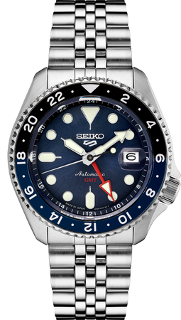 Seiko 5 Sports SKX Sports Style GMT Series. The first Seiko 5 Sports watch with a GMT function, the dynamic SKX design provides on-the-go durability and style. Equipped with automatic technology that you control with every movement, this versatile watch is powered by a 24-jewel movement that beats at a frequency of 21,600 vibrations per hour, with a power reserve of approximately 41 hours and manual winding capability. Framed by a metalized, bi-color GMT bezel, the blue dial features bold luminous hands and markers, and a magnified date calendar, as well as a large GMT hand for instant visibility. A classic five-row stainless steel bracelet, with tri-fold push button release clasp and lock, adds rich texture and wearability, while the stainless steel case includes a screwdown see-through caseback for a view of classic timekeeping in action. 10 bar, 100M Water Resistant