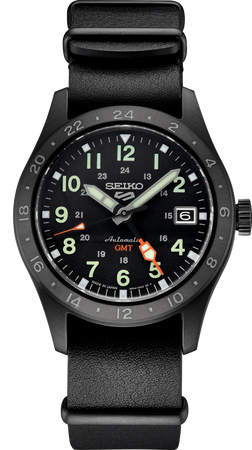 Seiko 5 Sports Field GMT. For decades, Seiko 5 Sports has delivered consistently high levels of reliability, durability, and performance. Equipped with automatic technology that you control with every movement, this versatile watch combines the clear and highly visible design elements of the Field style with the convenience of viewing the time in a second time zone. This timepiece is powered by a 24-jewel movement that beats at a frequency of 21,600 vibrations per hour, with a power reserve of approximately 41 hours and manual winding capability. Framed by a metalized black GMT bezel, the black dial features bold luminous hands and markers, a date calendar, and a large red-orange GMT hand for instant visibility. A black leather strap adds rich texture and wearability, while the coordinating stainless steel case with black hard coating includes a screwdown see-through caseback for a view of classic timekeeping in action. 10 bar, 100M Water Resistant