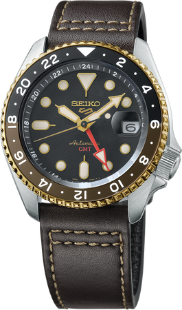 Seiko 5 Sports SKX Sports Style GMT Series. Adding new richness to classic sport/dress design, this dynamic watch offers a new variation on the popular “SKX” style. Equipped with automatic technology that you control with every movement, this versatile watch is powered by a 24-jewel movement that beats at a frequency of 21,600 vibrations per hour, with a power reserve of approximately 41 hours and manual winding capability. The black dial features bold luminous hands and markers and a magnified date calendar, as well as a large red GMT hand for instant visibility and is framed by a sleek gold, black, and dark brown GMT bezel. A brown leather strap, with contrast stitching, the first in the series, adds rich texture and wearability, while the stainless steel case includes a screwdown see-through caseback for a view of classic timekeeping in action. 10 bar, 100M Water Resistant