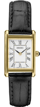 From the Essentials Collection. Offering classic designs, the Essentials Collection provides the ideal solution for everyday wear. Crafted of stainless steel in gold-tone finish, this elegant watch, with sophisticated rectangular case, features a traditional white dial with Roman numerals and finely shaped hands, cabochon crown and black leather strap for perfect day-to-evening style. 3 bar, 30M Water Resistant